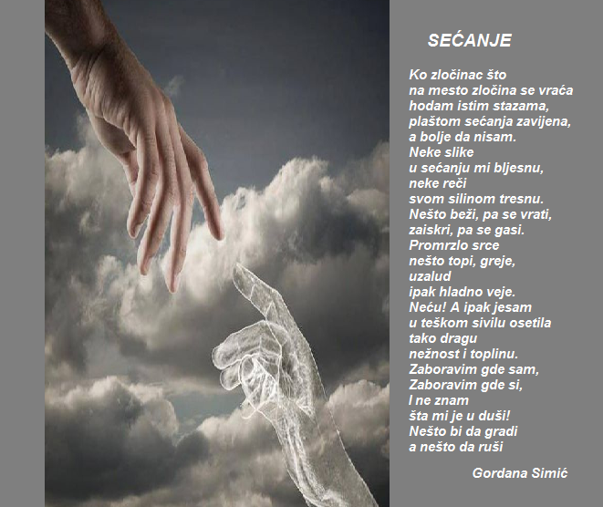 dec 29, 2016 Saljin prozor u svet poezije: Pesma Gordane Simić – Sećanje ključne rečiGordana SimićSalja P.SlovenskiSaljin prozor u svet poezijesecanje FacebookTwitterEmailViberReddItWhatsAppTelegramPrintPinterestTumblrLinkedinMixVKDiggLINENaver Facebook Prethodni tekstDa li ste znali: 575Sledeći tekstBiljana Bajinović: To je dobro. Salja P. SlovenskiŽivi u Ljubljani poeziju piše od detinjstva piše dosetke šale i aforizme. PROČITAJTE! Knjige Lončar među najboljim pjesnicima planete: Objavljeni rezultati za 2025. Zoran Todorović - dec 13, 2025 Mesečina Gordana Šolević Subotić: Duše si klet Gordana Šolević Subotić - dec 7, 2025 Mesečina Zehra Bajić Alić: Krofna na dlanu Zehra Bajić Alić - dec 7, 2025 Atelje Atelje Dina Devića Dino Dević - nov 21, 2020 Satatatira Dnevna doza aforizma Srđan Simeunović Sendan - sep 5, 2016 Satatatira Dnevna doza aforizma Nebojša Čandić - jun 4, 2018 Zanimljivosti 30 činjenica o poslednjem ruskom caru Nikolaju II koje će vas zaprepastiti: Komunistička vlast nije dozvoljavala da se o ovome piše niti govori Zoran Todorović - nov 22, 2017 Magazin Zdravlje i lepota: Prirodna metoda za podmlađivanje lica Ema Vitković - maj 28, 2018 Otvorena vrata Mala matura će se snimati, a uniforme obavezne Zoran Todorović - avg 8, 2017 Strip Frka i tabanje – Jakovitijevski pozdrav Mišo Koprivica - jul 31, 2018 Zanimljivosti Tvit dana Kristina Raković - nov 28, 2014 Otvorena vrata Likovni rad dana: Kućica za ptice Sunčica Miščević - feb 25, 2015 Atelje Atelje: Caught at dusk_Oil on canvas_120x150cm_2013 Ana Cvejić - okt 11, 2017 Satatatira Karikatura dana Petar Pismestrović - apr 29, 2025 Priključenija Konkurs: UAS Godišnja nagrada za 2017. Zoran Todorović - sep 4, 2018