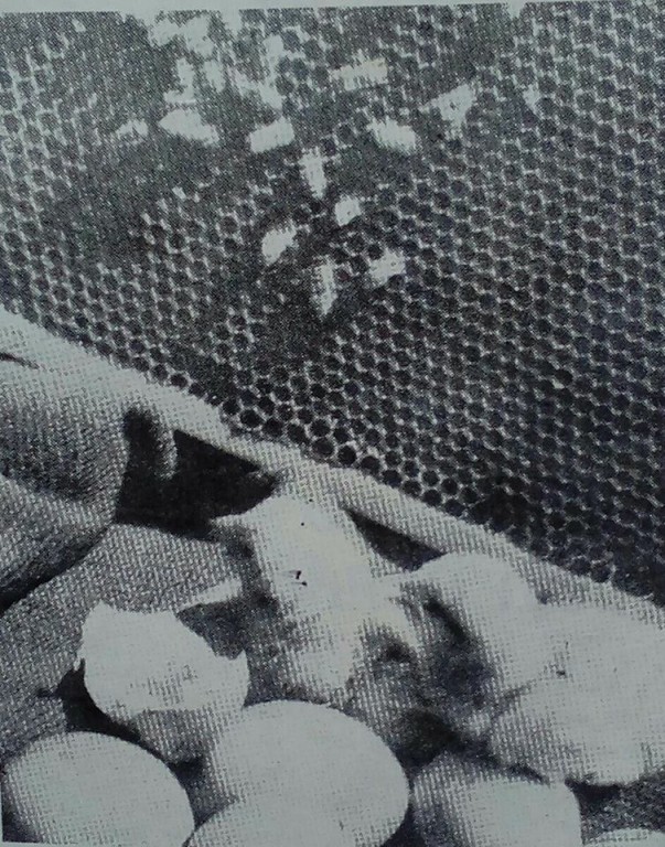 Na slici su pilići izleženi u košnici, a pored je, kao dokaz, podignuti ram.