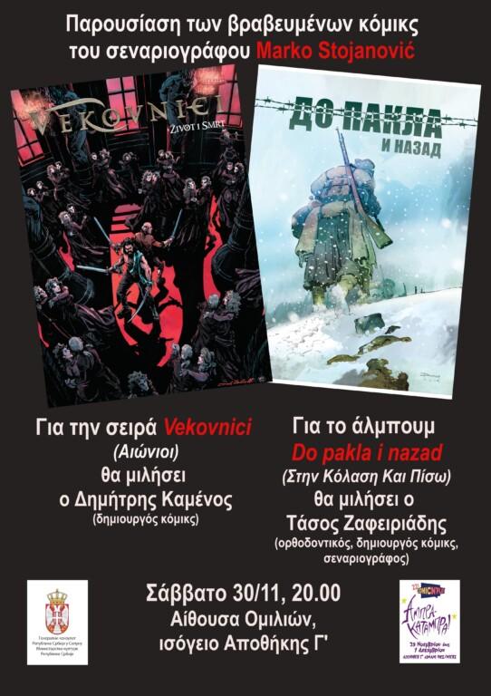 Najstariji festival stripa u Grčkoj, Comic N`Play (Komik end plej), koji se organizuje od 2001. godine, ove godine se održao 29. novembra do 1. decembra u Solunu. Organizatori su odlučili da u 22. izdanju festivala po prvi put predstave srpski strip grčkoj publici. U tu svrhu su kao reprezentativni stripovi srpske strip scene odabrani serijali “Do pakla i nazad” i “Vekovnici” scenariste Marka Stojanović i mnogobrojnih crtača. Stojanović je dobio poziv da lično prisustvuje festivalu i time postao i prvi srpski strip autor koji je bio gost ovog festivala u 23 godina njegovog postojanja. Izložba “15 godina Vekovnika”, koja je pre ovog izlaganja postavljena 15 puta širom Srbije, Bosne i Hercegovine, Rumunije i Bugarske, bila je centralna izložba 22. Comic N`Play festivala i nju je za tri dana trajanja manifestacije videlo blizu 3000 posetilaca. Na inicijativu organizatora Stojanović je obavio i stručno vođenje kroz izložbu za prisutne strip autore iz Grčke, Severne Makedonije i Rumunije, tokom kojeg je izlagao o ovom strip serijalu koju je sem Srbije objavljivan i u Grčkoj, Hrvatskoj, Rumuniji, Severnoj Makedoniji, Bugarskoj, Bosni i Hercegovini, Češkoj, Crnoj Gori, Velikoj Britaniji i Holandiji.