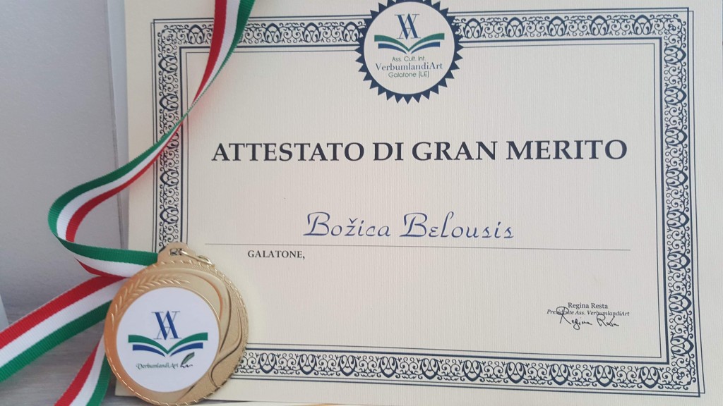 Naime, na osnovu protokola o saradnji i razmeni kulturnih dobara između udruženja književnika Verbunlandi Art Kazerta,iz Italije i poznatog Udruženja romskih književnika, naša književnica Božica Velousis je kao počasna članica Udruženja romskih književnika u okviru razmene pesničkog i književnog stvaralaštva za jednu od pesama koju je objavila u domenu svoje zbirke poezije, od strane gospođe Mirjane Dobrila Vinćenco Romanelo dobila značajno priznanje za doprinos književnom stvaralaštvu.