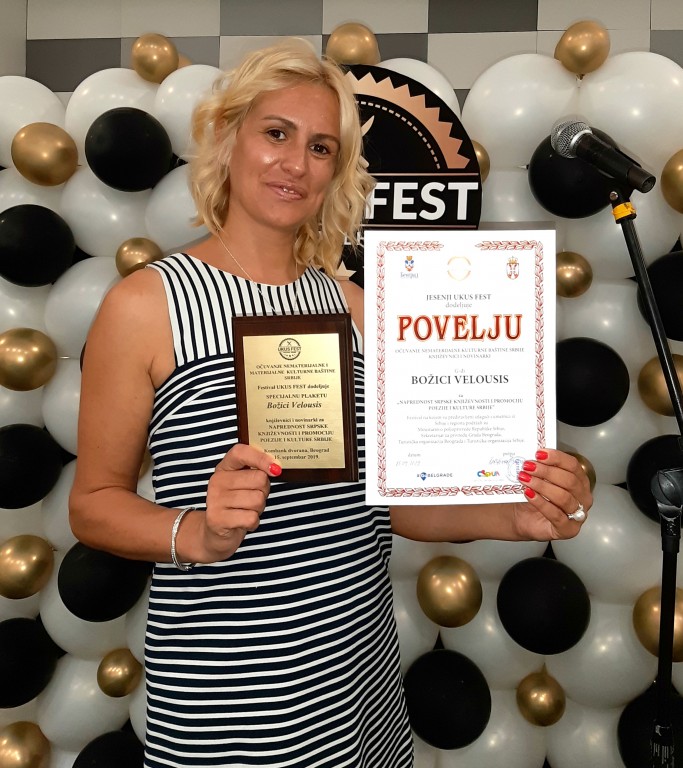 Književnica, pesnikinja i novinarka, istaknuta Božica Velousis i te kako ima povoda za slavlje! Naime, ona je danas na najposećenijem dvodnevnom festivalu „Ukus Fest“ u beogradskoj Kombank Dvorani u saradnji sa Ministarstvom Poljoprivrede Republike Srbije, Sekretarijata za privredu Grada Beograda, Turističke organizacije Beograda i Turističke organizacije Srbije specijalno nagrađena počasnim priznanjima, za naprednost srpske književnosti, promociju poezije i kulture Srbije! Ovim nagradama takoreći prestonice Srbije, Božica Velousis je još jednom potvrdila uspešnost u misiji očuvanja nematerijalne kulturne baštine Srbije, kako i piše na jednoj od plaketa koju je ovom prilikom dobila.