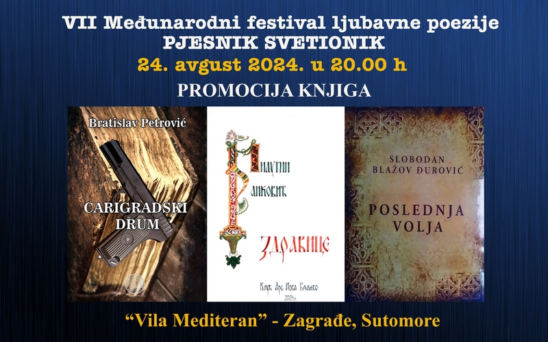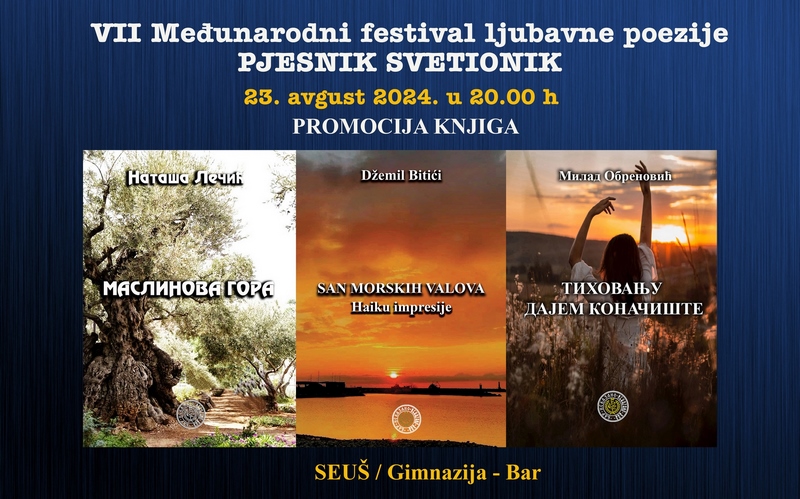 Biće predstavljene sljedeće knjige: “Maslinova gora” – Nataše Lečić, “San morskih valova” – Džemila Bitićija, “Tihovanju dajem konačište” – Milada Obrenovića, “Carigradski drum” – Bratislava Petrovića, “Zdravice” – Milutina Rankovića, “Posljednja volja” – Slobodana B. Đurovića i “Alt” – Roze Bojanove.