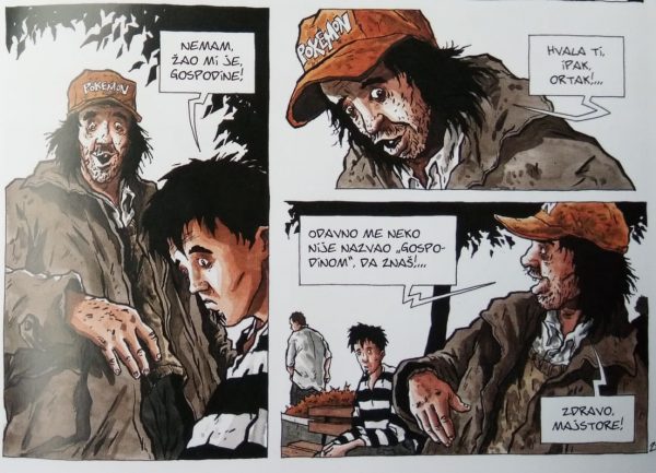 Zamislimo mladog čoveka punog poleta, kome je jedini pravi prijatelj negde preko okeana, od rođaka se spominje jedino (tamo neka) stara tetka od koje je nasledio kuću, i sad je spreman da se kao slobodni umetnik baci u kreativni ciklus u svetu stripa – porudžbine su tu, i sve izgleda tako perspektivno… Dok u bunilu i šoku, pri kome mu se čini da ga spasioci otimaju, ne shvati da mu je kuća stradala u požaru, a njemu preostaje da se potuca i snalazi sasvim sam, nailazeći na izvrdavanja od strane osiguravajuće kuće sa kojom je upravo bio potpisao ugovor, na neosetljivost institucija koje slede svoja pravila (banka, hotel), na nepredusretljivost društva uopšte, osim nekolko beskućnika – sapatnika (dok je npr. jednom komšiji bilo krivo što nije imao čime da snimi tok požara!)
