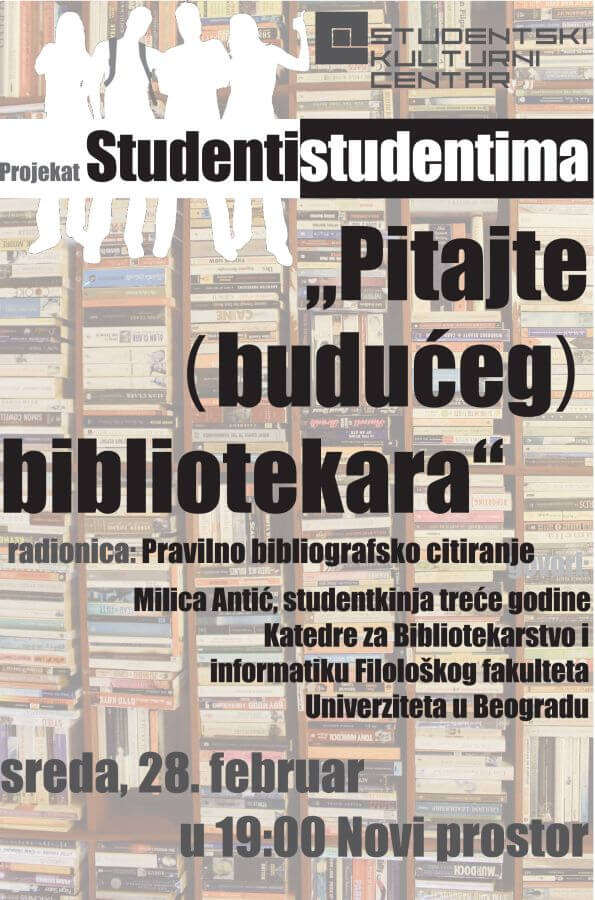 U Studentskom kulturnom centru (SKC Beograd) u sredu 28. novembra u 19h organizuje se radionica u okviru projekta Studenti studentima na temu: “Pitajte (budućeg) bibliotekara”.