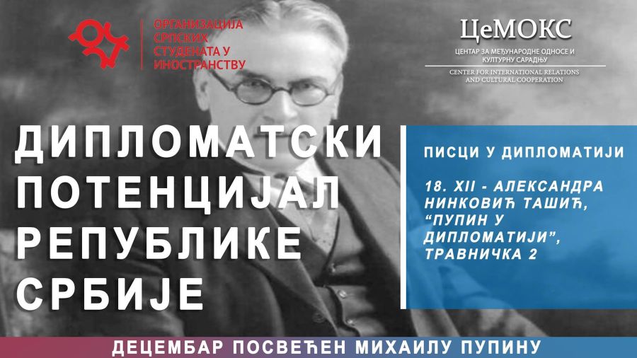 Organizacija srpskih studenata u inostranstvu i Centar za međunarodne odnose i kulturnu saradnju će u ponedeljak, 18.12., sa početkom u 17 časova na Fakultetu za diplomatiju i bezbednost, predstaviti fazu projekta „Diplomatski potencijal Republike Srbije“ za mesec decembar.