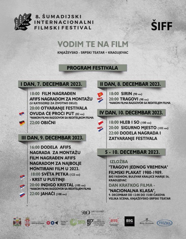 Po osmi put vam predstavljamo najbolje savremene filmove iz zemlje i inostranstva u srcu Šumadije. Slogan 8. izdanja ŠIFFa je Vodim te na film! i od 7. do 10. decembra vodimo vas na čak 11 dugometražnih filmova koje možete pogledati potpuno besplatno. Pored toga što je ulaz na sve sve projekcije besplatan publika je ta koja odlučuje o najboljem filmu 8. festivala.