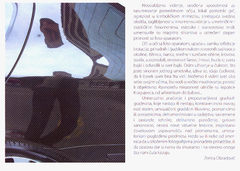 „Очи у очи са фото апаратом упада у замку рефлексије и ротације, природних и људском руком створених саживеоца околине. Кишница, барица, снежне и сунчане облине, кровови, стакла, аутомобили, лимови, буде из света бајки и одводили у свет бајки. Равнотежу мисаоности улиричиле су лепотице Крагујевца, од архитектуре до љубави, написала је Зорица Обрадовић за изложбу фотографије „Одраз”.