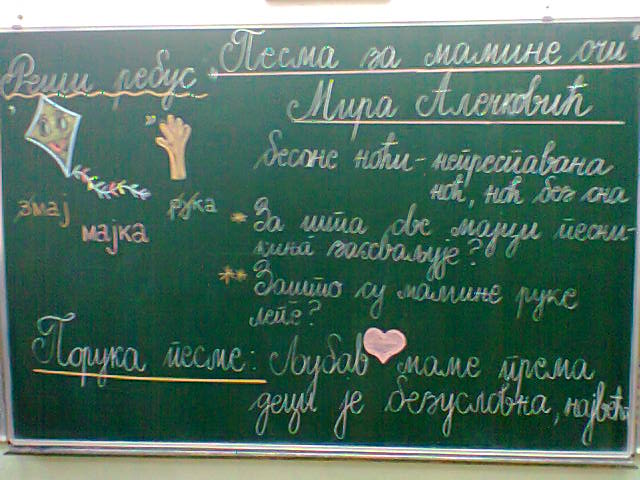 Aleksa Tanasijević i Nikola Jovanović apr 17, 2015 Tabla: Pesma za mamine oči Aleksa Tanasijević i Nikola Jovanović Učiteljica: Dragana Petrović Odeljenje II1 Osnovna škola “Radoje Domanović” Kragujevac Foto: Z. Todorović ključne rečiDragana PetrovićOsnovna škola "Radoje Domanović" KragujevacPesma za mamine očitablaučiteljica FacebookTwitterEmailViberReddItWhatsAppTelegramPrintPinterestTumblrLinkedinMixVKDiggLINENaver Facebook Prethodni tekstRecept: Salata od boranijeSledeći tekstRadni list iz matematike, drugi razred Zoran TodorovićOsnivač „Pokazivača“. Tvorac novakovanja. Čovek koji od života želi sve ili ništa, a trenutno živi negde između. PROČITAJTE! Obrazovanje OŠ ,,Dušan Jerković“ iz Inđije pobednik sedmog TreninGO izazova ,,Trčim za školu“! Zoran Todorović - dec 4, 2025 Kultura „Slova i životinje iz Miroslavljevog jevanđelja“ – dragocenost bliža osnovcima i predškolcima Zoran Todorović - avg 13, 2025 Obrazovanje Učenicima iz Srbije dve bronze na Međunarodnoj olimpijadi iz veštačke inteligencije u Pekingu Zoran Todorović - avg 12, 2025 Zanimljivosti Mozgalica nedelje (br. 102): Policija Zoran Todorović - jul 24, 2016 Mesečina Tanja Radivojević: Neću da odrastem Tanja Radivojević - nov 20, 2016 Otvorena vrata Jezičke nedoumice: Rukica ili ručica Zoran Todorović - jul 23, 2019 Zanimljivosti Ginisovi rekordi: Najtopliji okean Zoran Todorović - jun 5, 2015 Satatatira Karikatura dana Darko Drljević - jun 18, 2018 Mesečina Zov sаmoće Labud Lončar - nov 25, 2015 Mesečina Zoran Todorović: Đurđevdanska Zoran Todorović - maj 6, 2022 Kultura Leskovac – Najveći javni čas u Istočnoj Evropi! Mišo Koprivica - okt 12, 2024 Otvorena vrata Završni ispit – srpski jezik Prvoslavka Marković - jun 16, 2015 Mesečina Marina Milosavljević: Snaga nove ljubavi Marina Milosavljević - nov 9, 2019 Mesečina Fotografija dana Marija Mladenović - sep 3, 2014 Kultura Međunarodna strip konferencija “Kragujevac, čista desetka” Kragujevac Comic Con 2020. Svet stripa - dec 11, 2020