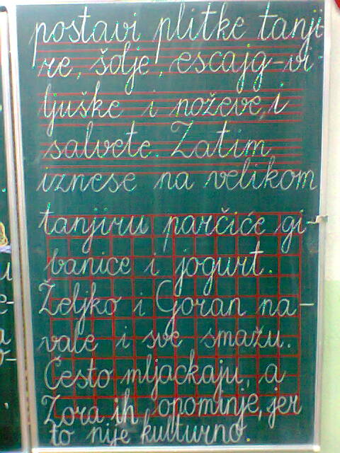 Filip Đorđević i Mia Mijailović apr 3, 2015 Tabla: Pisana slova latinice Filip Đorđević i Mia Mijailović Učiteljica: Dragana Petrović Odeljenje II1 Osnovna škola “Radoje Domanović” Kragujevac Foto: Z. Todorović ključne rečiDragana PetrovićOsnovna škola "Radoje Domanović" KragujevacPisana slova latinicetablaučiteljica FacebookTwitterEmailViberReddItWhatsAppTelegramPrintPinterestTumblrLinkedinMixVKDiggLINENaver Facebook Prethodni tekstRecept: Čorba od šargarepeSledeći tekstSveska: Deljenjem brojem 2 Zoran TodorovićOsnivač „Pokazivača“. Tvorac novakovanja. Čovek koji od života želi sve ili ništa, a trenutno živi negde između. PROČITAJTE! Obrazovanje OŠ ,,Dušan Jerković“ iz Inđije pobednik sedmog TreninGO izazova ,,Trčim za školu“! Zoran Todorović - dec 4, 2025 Kultura „Slova i životinje iz Miroslavljevog jevanđelja“ – dragocenost bliža osnovcima i predškolcima Zoran Todorović - avg 13, 2025 Obrazovanje Učenicima iz Srbije dve bronze na Međunarodnoj olimpijadi iz veštačke inteligencije u Pekingu Zoran Todorović - avg 12, 2025 Satatatira Satirična poezija Dejan Tofčević Deana Sailović - okt 19, 2017 Mesečina Revolucije Aleksandar Antić - avg 2, 2016 Knjige Preporuka: Anniena pjesma-Catherine Anderson Amra Kamberović - okt 8, 2015 Zanimljivosti Vic dana: Odlično Đorđe Todorović - mar 12, 2019 Satatatira Dnevna doza aforizma Nada Karadžić - dec 16, 2016 Zanimljivosti Zašto se Tesla nije oženio Zoran Todorović - jun 6, 2014 Mesečina Ljubav nije šarena laž Admir Džibrić - sep 17, 2015 Knjige Varnice na stazi ljubavi Zoran Todorović - jun 20, 2021 Zanimljivosti Misao dana Prvoslavka Marković - jun 20, 2019 Satatatira Dnevna doza aforizma: Predrag Peđa Đakonović Predrag - Peđa Đakonović - okt 7, 2019 Atelje Atelje:..I bi svetlost…( ulje na platnu, 40x65cm) Dragana Simić - okt 17, 2017 Strip A kad će bre ON, napokon, ako je SUPER!? Mišo Koprivica - sep 26, 2017