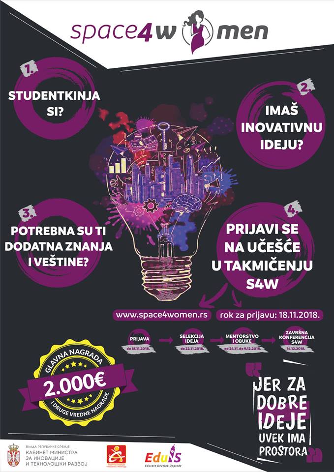 Takmičenje Space4Women namenjeno je studentkinjama osnovnih, master ili doktorskih studija svih fakulteta Univerziteta u Novom Sadu koje žele da preuzmu inicijativu, razmišljaju kreativno i zakorače u svet preduzetništva.