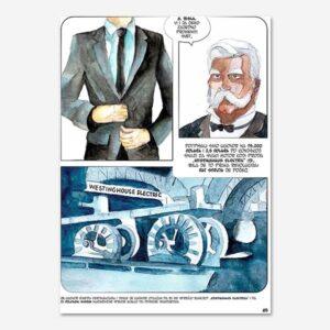 izumitelja Guljelma Markonija, kao i nejasnoća oko patentiranja radio prenosa (Markoni je, podsetiću, dobitnik Nobelove nagrade na ovom polju, premda se Tesli pripisuju sva njegova dostignuća). Samim tim, nekako je i tu poetska pravda da upravo jedan Italijan, jedan autor nastanjen u Beogradu, sastavi jedan grafički roman na temu Nikole Tesle, njegovog života od samog rođenja jedne olujne noći do njegovog poslednjeg uzdaha u hotelskoj sobi u Njujorku tik pred posetu američkih obaveštajnih službi.