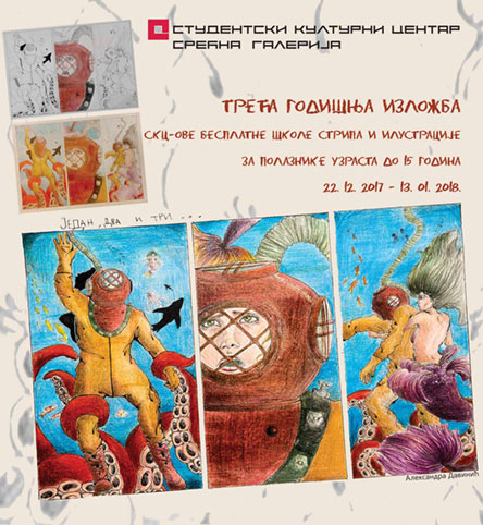 Srećna Galerija Studentskog kulturnog centra Beograd ima čast da pozove Vas i Vaše prijatelјe na otvaranje TREĆE GODIŠNJE IZLOŽBE SKCOVE BESPLATNE ŠKOLE STRIPA I ILUSTRACIJE ZA POLAZNIKE UZRASTA DO 15 GODINA, u petak, 22. 12. 2017. u 19:00 časova.