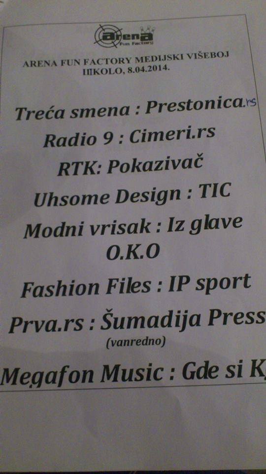 U Kragujevcu, u Tržnom centru „Plaza“, oržano treće kolo Medijskog višeboja. Arena Fun Factory bila je odličan domaćin. U dobroj atmosferi predstavnici medija su se zabavili i pokazali zavidan talenat. Prenosimo deo atmosfre iz kragujevačke Arene. Svima puno uspeha u narednom kolu želi tim “Pokazivača”.