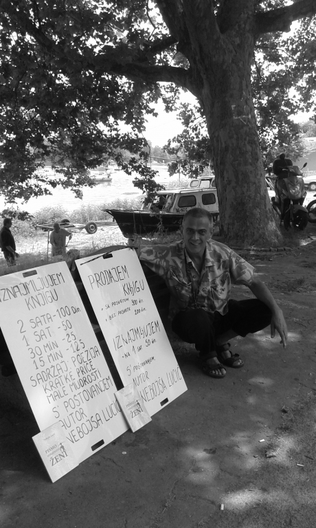 Razgovarali smo nekoliko minuta i saznao sam da i on kao i mnogi drugi pisci i pesnici “nekomercijalnih naslova” u želji da svoje delo učini dostupno čitaocima koristeći sopstvenu maštu šeta od klupa na keju preko Knez Mihajlove ulice i Kalemegdana do Ade Ciganlije. Poneku knjigu proda po veoma popularnoj ceni a vrlo često izmami osmeh pa i poneku pohvalu za svoj rad.