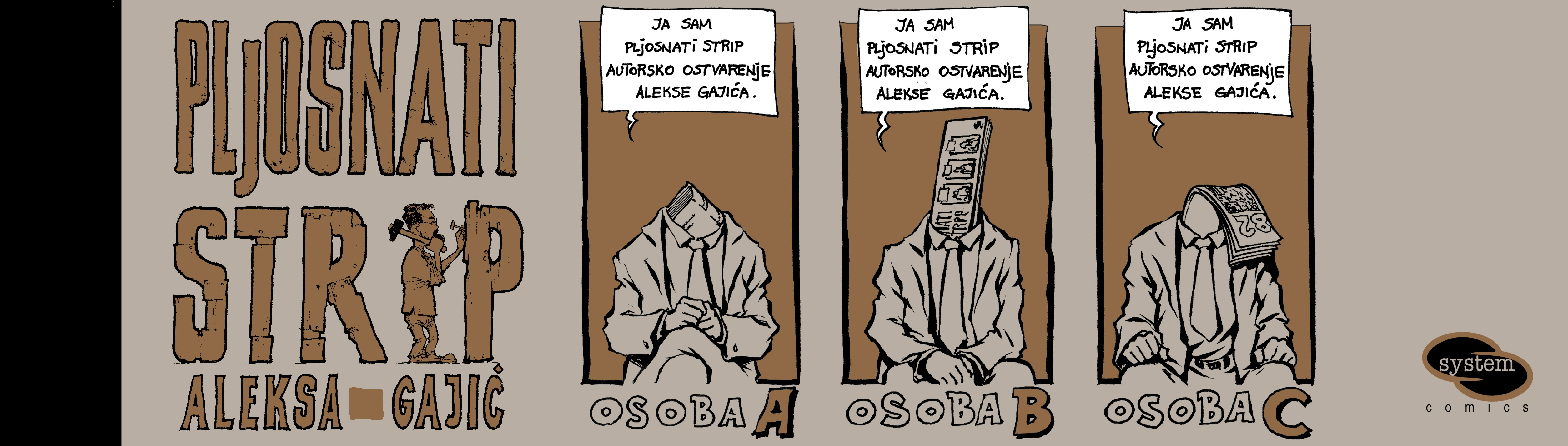 Hronološki poslednji i najsvežiji na ovoj listi, „Pljosnati strip“ je jedna duguljasta (bukvalno) sinteza svega onog što je činilo „šrafove“ (stripovska naracija) i svega onog što je činilo goreopisanu skreparnu (odsustvo filtera ludila); a opet, nije ništa od toga. Rađen u formatu 42x12cm, strip je, opet poput „šrafova“, kuriozitet na srpskoj strip sceni kao jedini takve vrste. U kratkoj tradiciji „Skrepbuka“, i ovde Gajić s vremena na vreme zalepi nešto, te s vremena na vreme iskoristi čudnu tehniku za dobijanje crteža, te s vremena na vreme ubaci svoje igre rečima putem igre crtežom. Ono što izdvaja ovaj pljos’ od „Skrepbuka“ je dosta namerniji meta-pristup. „Pljosnati strip“ je izuzetno svestan sebe, što, opet u tradiciji „šrafova“, naglašava njegova naslovnica, gde vam se on – strip – lično obraća. Kao takav, zadužen je da trpi veliki broj pojavljivanja samog autora unutar stripa da komentariše pitanja koja ga niko izvan stripa ne pita. Gajićev izvansmisao ovde već izbacuje plodove – ako računamo da je kroz „šrafove“ klijao, a u skreparni cvetao – i pored sad već samoupravljajućeg humora se provuče i neki simpatični eksperiment, poput serije kratkih stripova koji sačinjavaju ljudsko lice (simpatično nazvan „Glavni strip“) ili serije od deset naizgled nepovezanih apstraktnih slika koje imaju značenje i dalje nepoznato čitaocu, čak i nakon višestrukog povratka istim. I naravno, igrarije rečima i crtežom nastavljaju svoju hegemoniju, ne jenjavajući čak ni u poslednjim kadrovima, sa naravno besramnom samoreklamom autora, koja je sve samo ne ozbiljna.