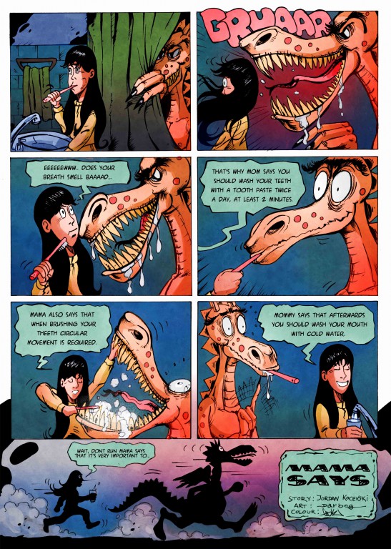 Ljudima je potreban smeh, makar oni bili mračnjaci. I Jordan i Darko ovo dobro razumeju, te nije ni čudo što se jedna njihova kreacija, „Čudovišta“, javlja u ovom albumu na dva mesta, kao jedna duža priča i kao par kraćih. Čudovišta iz „Čudovišta“ su gotovo parodije čudovišta iz „Udruženja monstruma“, s bitnom razlikom oko toga što nisu baš za decu. Mnogo inspiracije tu ima i iz crtanih filmova sa „Cartoon Network“ kanala, plus „Šarki i Džordž“, itd. I naravno, jedan od datih stripova je u koloru, u čemu je doprineo mladi Stefan Kocevski. „Naše kuče Roks“, „Carpe Diem“ i „Mama veli“ su naredne tri pričice glavna dva autora, i svaka od njih funkcioniše kao kraći vic. Jedna je o, pogodili ste, kučetu, druga je o klošarstvu (sa preokretom sličnim kao u seriji „The Mighty Boosh“), a treća je klasična dečija, sa aždahama i curicama. Sve su relativno bezbedne, sa puno zdravog smeha, pogotovo „Carpe Diem“ koja to uspeva s minimalnim dijalogom. U „Boogiemanu“ se nalazi poznati čisti stil Igora Jovčevskog, i sama priča je komotno horor-komedija u malom. Otac, sin i Babaroga…Boogieroga…kako god. Naredne dve priče su ponovna saradnja Jordana i Andreja Maneva, „Zli vuk“ i „Potreban ubica zmajeva“. Obe su slatki mali preokreti u klasičnim bajkama ili pričama epske fantastike. Prva je stripovsko spajanje dve bajke, „Crvenkape“ i „Zlatokose i tri medveda“, gde je, spojleri, vuk taj koji nagrabusi. Druga priča je epska borba sa zmajem koja se završava drekom majke da otac i sin odu više na spavanje. Ova pogotovo je Jordanu draga jer vuče poreklo iz više ličnih iskustava sličnim datom u stripu. Poslednja humoreska je „Preko trnja do zvezdi“, gde ovaj put Jordanov scenario oživljava Vesna Ničevska. Mali iskorak u erotsku humoresku je uvek dobrodošao, a ovaj, u šest-sedam kadrova, je prelep – kratka svađa, malo emocija, malo zdravog razuma i gaženje po trnju. Što bi rekli na reklamama za „Master-card“ – neprocenjivo.