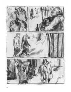 Interesantno je navesti da Šivec koristi retko viđenu tehniku u stripu – crtanje ugljem. Ovde me na neki način podseća na Zvonimira Vidića, vajara koji je principe vajarstva primenio u svom radu na stripu “Međugroblje” po scenariju Zorana Penevskog. I ovde ulazi ono “crno na belo” što sam istakao na početku. Naime, priča koja se bavi životima slovenačkih beskućnika ni ne može da bude dočarana bojom, već mora da bude ogoljeno, iskreno i bez pardona – da se papir ožeže ugljem, što bi se reklo.