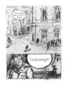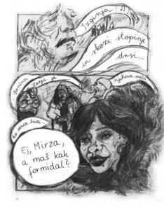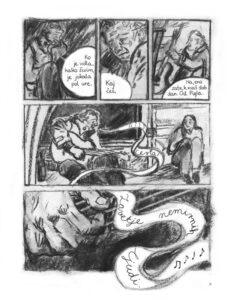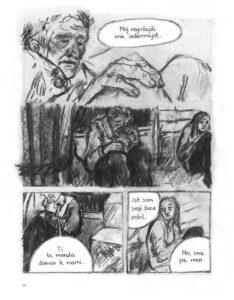 Ali problem sa ugljem je što je nepredvidiv i neuredan, što se, nažalost, odražava i na crtež. Šivec lepo vodi priču, ali više puta sam uhvatio sebe kako iznova i iznova zveram u tablu kako bih prokljuvio šta se na njoj zapravo nalazi. I nije u pitanju štampa – naposletku, veliki broj tabli se sasvim jasno vidi – već je očito do stila autorke. „Črepinje“ je važna priča koju treba ispričati, međutim teško da će glavnotokovski čitaoci i šira publika moći da pređe preko ovakvog crteža na trenutke.