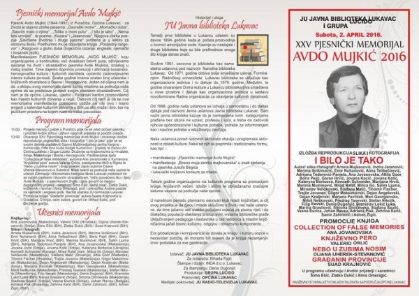 2.4. u Lukavcu je održan XXV PJESNIČKI MEMORIJAL “Avdo Mujkić”, u organizaciji JU Javna biblioteka Lukavac i grupe “Lucido”, na kome je učešće uzelo veliki broj književnika iz cijelog regiona, kao i fotografi iz Kumanova i Lukavca sa reprodukcijom umjetničkih slika i fotografija.