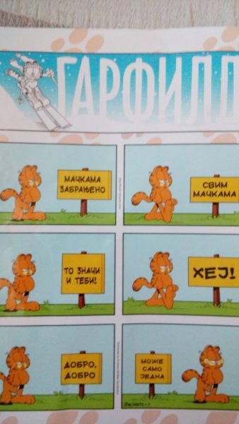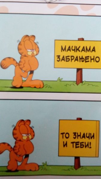 Ilustrovani pozdrav, uz nešto što bi trebalo da predstavlja njegovu superiornost; na ovoj tabli on bi trebalo da shvati i prihvati poruku tipa No passaran, ali… ipak je, (treba li se čuditi kako?), učinjen izuzetak! Mogli bismo reći, uspelo ili ne No passaran, Garfildom sam očaran! Toliko, do sledećih zgoda.