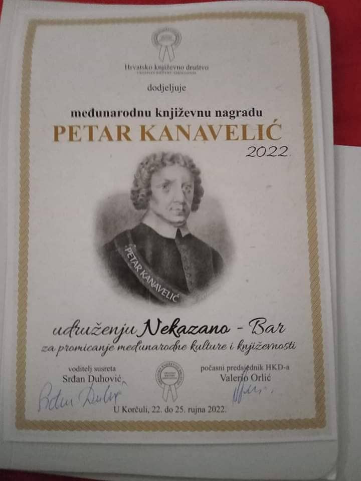 Na kraju susreta podijeljene su zahvalnice za učesnike a „Nekazano“ je dobilo međunarodnu književnu nagradu „Petar Kanavelić“ za „promicanje međunarodne kulture i književnosti“ . U ime udruženje nagradu je primila Gordana Srećković, poznata književnica i kulturni poslenik, koja se zahvalila domaćinima.