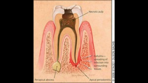 - postojanje fistuloznog otvora u predelu korena zuba (fistulozni otvor se manifestuje kao crvenkasti čvorić iz kojeg povremeno izlazi sekret)