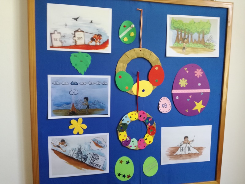 Neobična i zanimljiva bila su pojašnjenja o crtežima koji se tradicionalno nalaze na vaskršnjim jajima. To su slike koje podsjećaju na hrišćanski život: krst, pšenica i grožđe, riba, zvona, svijeća, lađa. Кrst-znak vaskrsenja i vječnog života. Pšenica i grožđe potrebni su da se naprave hljeb i vino, a Sveti Duh ih tokom Svete Liturgije pretvara u tijelo i krv Hristovu, simbol pričešća. Riba, znak raspoznavanja, je riječ nastala od početnih slova grčkih riječi „Isus Hristos Sin Božji Spasitelj“. Zvona nas zovu na bogosluženje i prate od rođenja do smrti. Svijeća je „svjetlost svijetu“. Zemaljski život je putovanje, a crkva je lađa koja vodi spasenju.