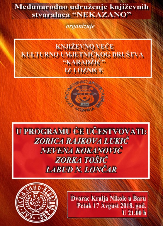 U organizaciji međunarodnog udruženja književnih stvaralaca i umjetnika „Nekazano“ iz Bara u Dvorcu kralja Nikole, u Baru, održano je književno veče pjesnikinja iz Loznice, inače članica književnog kluba KUD „Karadžić“.