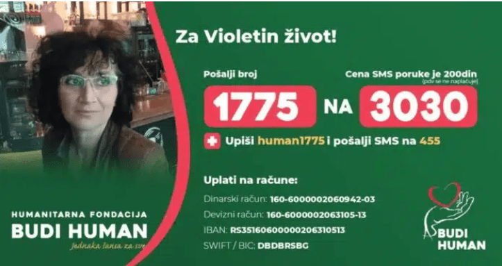 Humanitarna fondacija BUDI HUMAN – Aleksandar Šapić prikuplja novčana sredstva za Violetu Bojković (1968). 2021. godine usled lečenja virusa Covid 19 došlo je do sumnje lekara na drugu bolest prilikom čega je CT pregledom ustanovljena dijagnoza tumora glave pankreasa (C25 Neoplasma malignum pancreatis).Izvršeno je operativno lečenje holecistektomija sa holedohotomijom i bilio-digestivnom anastomozom. Lečenje je nastavljeno hemoterapijama u 4 ciklusa a zatim i zračenjem X nožem u predelu pankreasa. Uočene su nodularne promene u operativnoj loži kao i promena u sv jetre sa intenzivnom akumulacijom FDG koja ima PET/CT karakteristike sekundarnog depozita osnovne bolesti. S obzirom da terapije ne daju željene rezultate a bolest je u progresiji potrebno je da Violeta što pre nastavi lečenje u inostranstvu. Sredstva su joj potrebna za genetska ispitivanja radi određivanja imunoterapije, specijalističke preglede, laboratorijske analize, imunoterapije, izradu personalizovane vakcine, putne troškove kao i za troškove smeštaja u toku lečenja.