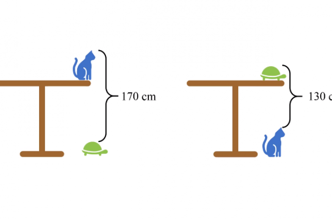 U zadatku se traži da se izračuna visina stola ako rastojanje od glave kornjače koja se nalazi ispod stola do glave mačke na stolu iznosi 170 cm, a rastojanje od glave mačke koja se nalazi ispod stola do glave kornjače na stolu iznosi 130 cm.