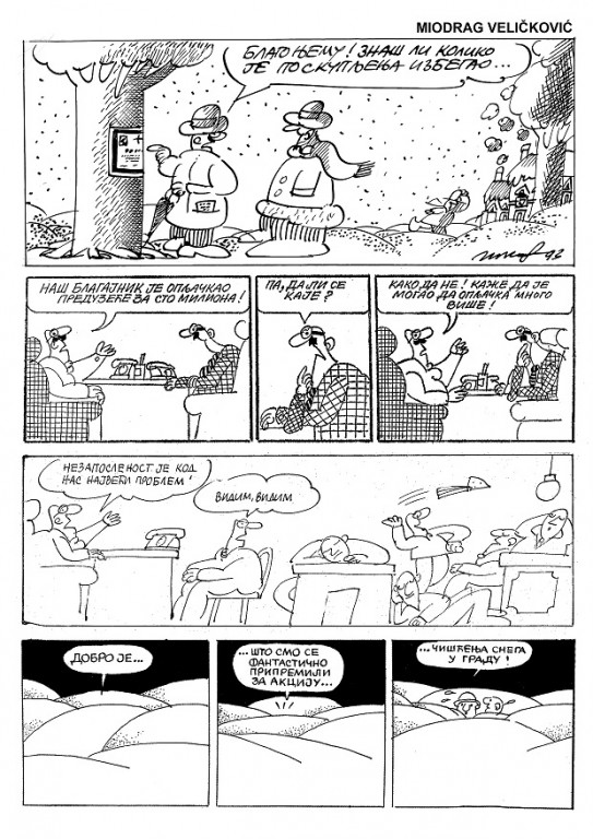 Ali crtež, sa sve prikladnom atmosferom, nije ništa bez reči, jer ipak nije poput onih silnih karikatura titlovanim „BEZ REČI“. Mivel briljira najviše svojim vazda aktuelnim umom; ne promiče mu ništa što je prećutna tema dana, što je toliko ironično i smešno da navodi intelekt na plač. Neke od najčešćih tema su mahom one koje su Srbi apsolvirali u svojim najtežim vremenima: korupcija, nerad, inflacija, iredentizam, lični i društveni poroci, te nedostatak perspektive, napretka, kvalitetnih međuljudskih koliko i međunarodnih odnosa, umerenosti u vremenu nemaštine, korektnosti u dobu bezobrazluka. Mivelovi likovi će doživeti da se cena hleba i mleka menja u minut, neretko dva uzastopce. Njihovi radnici će da lenčare po kancelarijama i kukaju kako nemaju ništa, dok će pošteni radnici (onoliko malo koliko ih osta) kroz usahli smeh komentarisati (ne)učestalost svoje plate – jednom u šest, osam, deset, dvanaest, dvadeset i četiri meseca…Pokakogde će i neki uberSrbin da uzdigne tri prsta…doduše u kontekstu koji će od istog napraviti sprdnju. Neretko će se nazirati trenutna situacija u regionu, sa nekim vrlo crnim osvrtima. Doći će dotle da opljačkani mora plaćati lopovu u tri rate putem čekova!