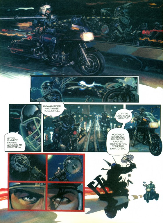 Doduše, šta čini ovu šestodelnu izmiksiranu priču posebnom? Da li su stvarno u pitanju samo banalni razlozi poput „Vidi, ovaj je isti Majkl Džekson“ izjava, ili akcionih klišea „Freeze, man!“ i „Damn you!“ [sic! za oba]? Ne, naravno. Kovačević negde već pri trećini stripa menja radnju za 180 stepeni i najednom junak, isti onaj koji se na početku stripa trkao za prestiž i ženu, prerasta u tragičnu figuru bez tela koja odlazi s neprijateljem u budućnost. U principu, cela radnja i cela postavka – ruinirani velegrad nakon nekakve nedefinisane apokalipse, a sam na pragu sledeće – su samo blagi temelj za Kovačevićev eksperiment. Možda deluje forsirano da klinja Pafi bude deo priče, i da baš u pravom trenutku naleće na Erona i baš na pravi način pomaže istom, ali kao i rane pojave Mašinoglavog i Karbur-Atora, Pafijeva storija nije slučajna. Svrha mu je da bude Eron u malom, da bude ona čista, dečija, neiskvarena paralela ovome kroz šta naš tamnokosi bajker prolazi. A donekle je i paralela sa Mašinoglavim. Sva trojica imaju pokoji ideal (i, kako to inače biva u ovakvim pričama, ideali sporednih likova ispadaju interesantniji od onih kod glavnog; u ovom slučaju, Eron pomalo kaska za prethodnom dvojicom), i kod sve trojice se ovo iskazuje onom jednostavnom pričom Čarlsa Fostera Kejna, gde se nečiji principi formiraju, rastu i eventualno ukvare. Ta paralela je vidljiva i hronološki: Pafi je detinja varijanta, gde se ti morali i ideje tek pojavljuju i brzinski formiraju. Eron je već onaj mladi momački stadijum, onaj gde se javlja mesijanska faza i nemoguća želja da se popravi svet. Mašinoglavi je već pozna varijanta ovoga. Cilj se čini daljim nego ikad, a sredstva postaju sve gnusnija, sve manje moralna, a saradnici još gori. Onda nije ni čudo što Eron podjednako deli bitne trenutke i s jednim i s drugim. Sa Pafijem se figurativno vraća u svoju prošlost, u grad odakle je došao, sa ciljem da ispuni svoj najčistiji ideal – spas Eni. Ono što sleduje nije slučajnost; Eron dobija telo Mašinoglavog, korupcija je već otpočela, ali ono jače je figurativna veza sa svojim budućim Ja. No, i Pafi je tu prisutan, zato što prošlost ne napušta, samim tim ni detinjstvo (ona stara dobra „Dete je otac čoveka“). Sa Pafijem, Eron se podsećao, vraćao se korenima. Sa Mašinoglavim odlazi u nesigurnu budućnost, u kadru koji je vrlo namerno ostao nedorečen. Štaviše, cela ta tabla je nedorečena. B.B. i Karbur-Ator, poput uvrnutih Rozenkranca i Gildensterna, ostaju kao zadnja linija odbrane protiv X protivnika, i sudbina im je ultimativno nepoznata, ali nagoveštaji navode na loše. Čak se i Pafi jada što su ga svi zaboravili, pogotovo Eron i Mašinoglavi, manifestacije njega iz budućnosti, aspiracije kojima teži. Zaboravljanje prošlosti je opasna stvar. No opet, i Eron i Mašinoglavi odlaze, za njima ostaje samo krst, simboličan za figurativnu smrt koja guta em celu ličnost, em svezajedno prošlost, sadašnjost i budućnost, em celu ovu priču.