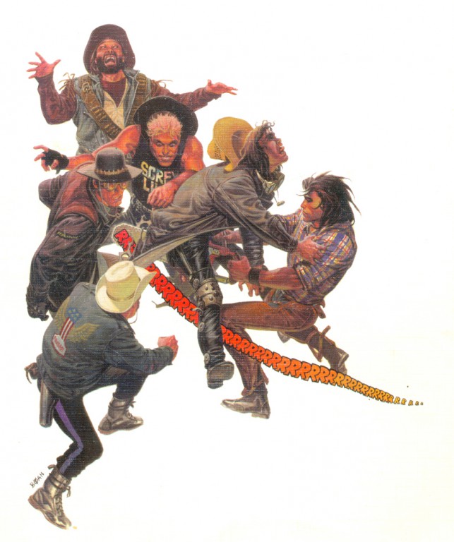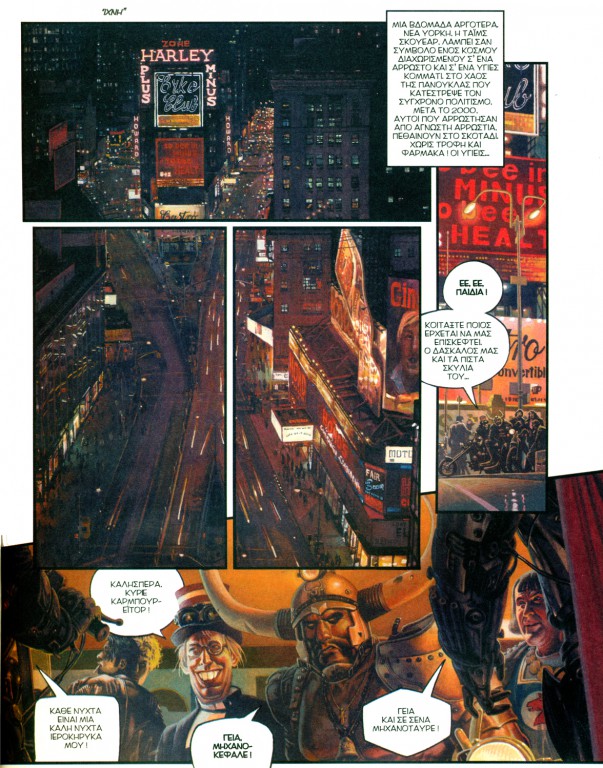 Međutim, Eron i Eni nisu jedini likovi. Srećom, tu je gomilica dodatnih aktera. Bajker Karbur-Ator i njegovi saradnici Bulbajker i Gosn. Mašinoglavi. Oni su donekle i definisani; B.B. je strvina koja puca, poput onih krupnih glumaca u filmovima koji samo služe za fizički sukob sa znatno manjim glavnim likom. Karbur-Ator počinje priču kao Eronov protivnik i protuvetina, ali završava istu lepim antiherojskim prelazom. Doduše, ne velikim, ali ga ima. No Gosn. Mašinoglavi je pun pogodak ovog stripa. Vidno omaž ili namerna parodija Terminatora (Švarcija, ne ovih ostalih što ne vrede ni da u pomije idu), Mašinoglavi ima svoju misiju, ali za razliku od robotizovanog Arnolda, on razmišlja, ljuti se, ekspresivan je. Što je teško postići s likom koji umesto lica ima permanentnu masku Darta Vejdera. Mašinoglavi je anti-heroj u onom dubljem, književnijem smislu; dubiozni moral, ljuštura ljudskosti, razočarenje čovečanstvom, žudnja za povratak mesu i odbitak tehnološkog telesnog zatvora u kojem se nalazi. Sve ovo nabrojano dodatno otežava akcije i reakcije Mašinoglavog, i sa sve poslednjim postupcima u stripu vidimo jedan maltene prirodni rast fiktivnog lika. Fiktivnog lika koji je, ponavljam, omaž ili parodija Terminatora.