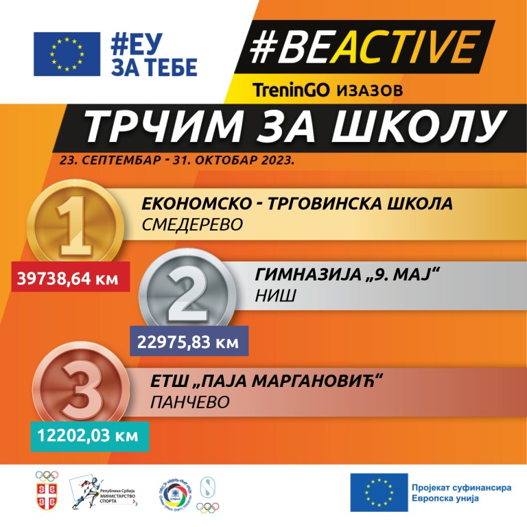 U ovogodišnjem Izazovu pobedila je Ekonomsko-trgovinska škola iz Smedereva koja je oborila rekord sa ukupno pretrčanih 39 739 kilometara, dok je drugo mesto osvojila Gimnazija „9. maj“ iz Niša sa pretrčanih 22 976 kilometara. Treće mesto zauzela je ETŠ „Paja Marganović“ iz Pančeva sa ukupno pretrčanih 12 202 kilometara. Evropska unija obezbedila je za sve tri škole vredne nagrade – sportsku opremu i rekvizite u vrednosti od 300.000 dinara za prvo mesto, 200.000 dinara za drugo i 100.000 dinara za treće mesto.