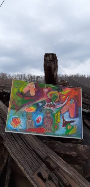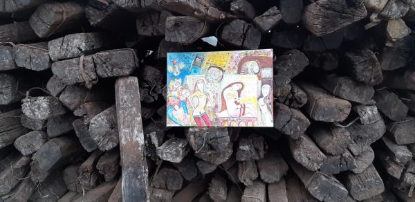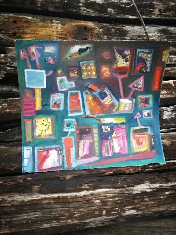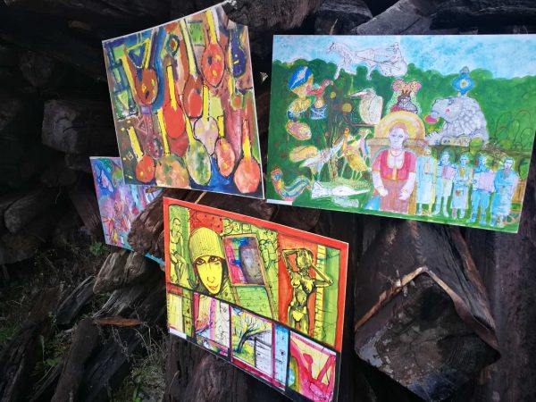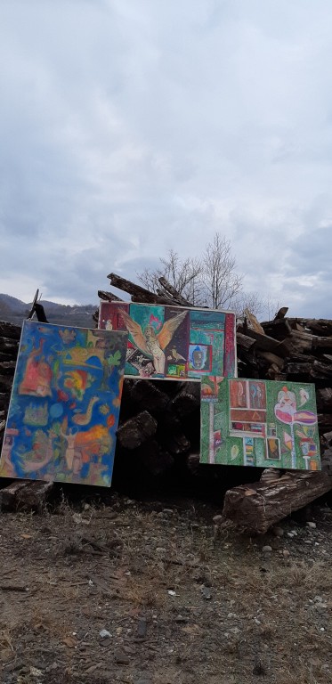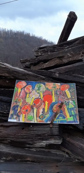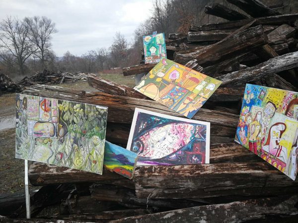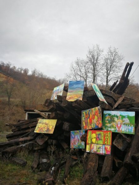 Вратише се до аута и почеше да износе нешто што је овако, из даљине, највише личило на слике. Ускоро је радознали и докони посматрач заиста могао да се увери да су ти необични правогуаоници већи и мањи били заправо осликани јарким бојама и заиста  све ово већ прерасте у загонетку. Зашто би неко по оваквом времену са двадесетак слика климао низ расплинути путељак нарочито ако су на крају тог пута само поцрнели од кише железнички прагови истоварени на неколико високих гомила који су подсећали на брежуљке стиснуте испод чувеног брда Таламбас.