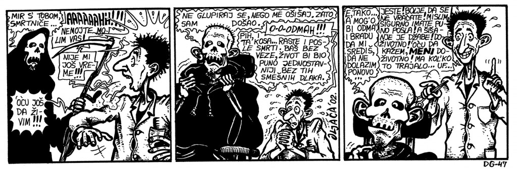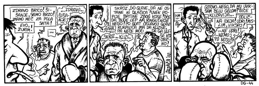 Čovek ima poprilično zavidan rezime – svratili su kod njega jedan prosečan čovek, jedan ciga mečkar, roker tek pred vojsku, lokalni kandidat, glomazna srpčina s junačkim loknama, plavušica, penzioner, ćelavi a bradati gospodin, te jedan neopisivi idiot, jedan anarhopanker, skinhed, hipik, fenser željan nularice, munze konza tebra stormaj, te jedna vrlo izfeminizirana persona tzv. feŽet, pa autobuski kontrolor, biciklista, biznismen, te jedan polućelavi čika ljubomorno ponosan na ono malo prečešljane kose, te dečače s vaškama, pecaroš, pa još jedan fenser ovog puta sa crveno farbanom kosom, zatvorenik, odeblja gospodža sa svojom pudlom, ponosni otac sa bebom, a onda jedan, pa drugi momak sa perikama (iskorišćenim u različitim svrhama), pa pljačkaš, lažni Deda Mraz, jedan lider države, pa nakon njega njegova supruga, te prodavac mašinica, svešteno lice, nanovo roker kao vojnik, te Kinez, Indijac, policajac, general, bokser sa sve trenerom, diler sa sve drogom, Bob Rok, Smrt glavom i kosom za košenje, mađioničar, odžačar, vatrogasac, štreber, komša-Laza švaler, navijač Crvene Zvezde, odnosno Delija, špijun, par jednojajčanih blizanaca, glumac, nadrogirana budala s kesom na glavi, košarkaš, pa Spilbergova kreacija ET, jedan omišićavljeni snagator, kolega berberin, muzički maestro, plastični hirurg koji liči na stripovskog Dilberta, pa duševno ne baš sama osoba sa kosom koja „raste iznutra“, Arnold Švarceneger, te jedna pijandura, jedna tetka sa bonsai drvcetom, još jedan pajkan, neki tinejdžer, klošar sa sve vonj i muve od konj, pseudocrnja reper, klasični Amerikanac, pravi Deda Mraz, te komičar obučen u grobara, Drakula, rastafarijanac, par standardnih mušterija, momci iz TV stanice spremni da intervjuišu, Meksikanac, i na samom kraju čovek koji donosi račune. I da, ovo prethodno je najduža rečenica koju je ovaj autor ikada napisao, u sklopu teksta o jako kratkom albumskom strip izdanju.